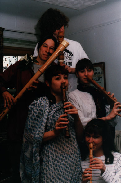 The Weasels were: Satie Airamé, lower right; Laurel Maury, right (with scarf); Ann Memhard, center (with sari); Maxine Neuman ("mama weasel"), second from top (with bass w/bocal); John Wilson, top (in dire need of haircut).